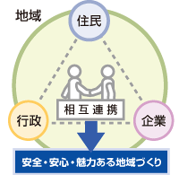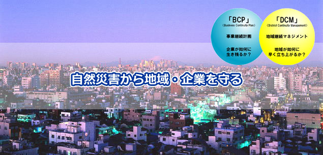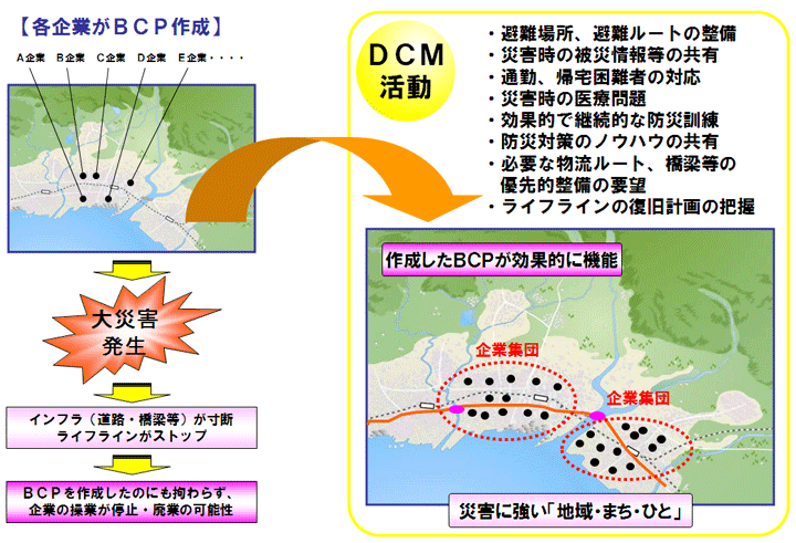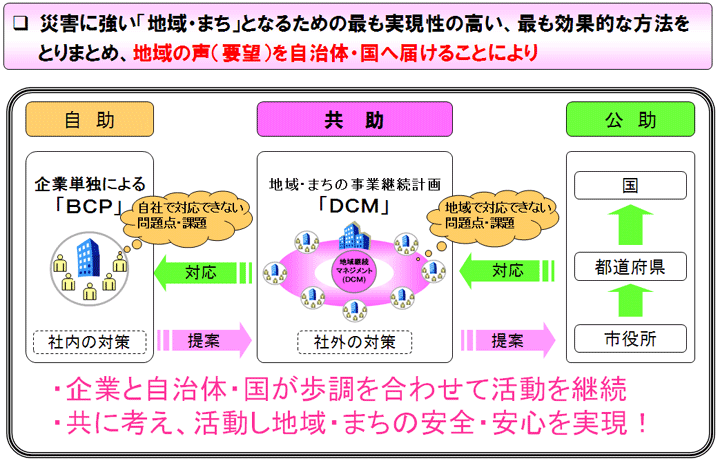 私たちDCM推進協議会では、これまでの個々の企業で個別に進められてきたBCP(事業継続への取組み)を発展させた『DCM(地域継続マネジメント)』をご提案し、地域の住民・企業・行政の連携による地域防災力の向上を目指しています。 DCMとは、District Continuity Management(地域継続マネジメント)の略ですが、その理念は、「企業・住民・行政が協働して、個々の会社や個人だけでは解決できない、ライフライン、交通インフラ等の早期復旧の方法を検討し、災害に強い地域を作ろう《というものです。災害に強い地域であれば、そこで暮らす人々や、地場の産業も強くなります。そのことは、地域の活力UP、大切な産業の継続につながります。